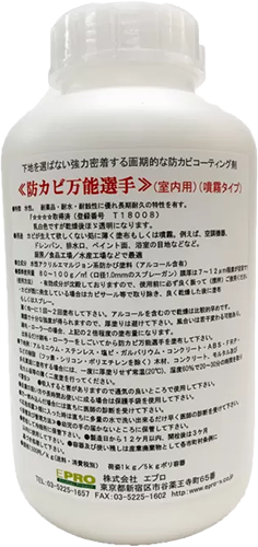 アクリル・水性の薄膜なので膜の強度はあまり無いため、外部には適しませんが、何より対象の素材を選ばず(木部、鉄部、アルミ、樹脂部分など)施工する事で簡易的に表面を『防カビ』する事が出来ます。アルコールが3割ほど入っているので殺菌性もあり、比較的乾燥も早めです。一般的な水性塗料(100~150ミクロン)などに防カビ剤(インナーミル550)を混ぜての長期間に亙る防カビ性能には劣りますが、簡易施工としては十分な防カビ性能を持っています。