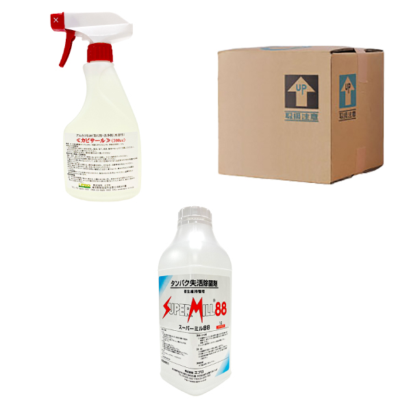 また、無臭の【スーパーミル88】は漂白力・洗浄力はありませんが、カビ発生の激しくない部分ではその優れた持続的除菌力で微生物を抑止します。